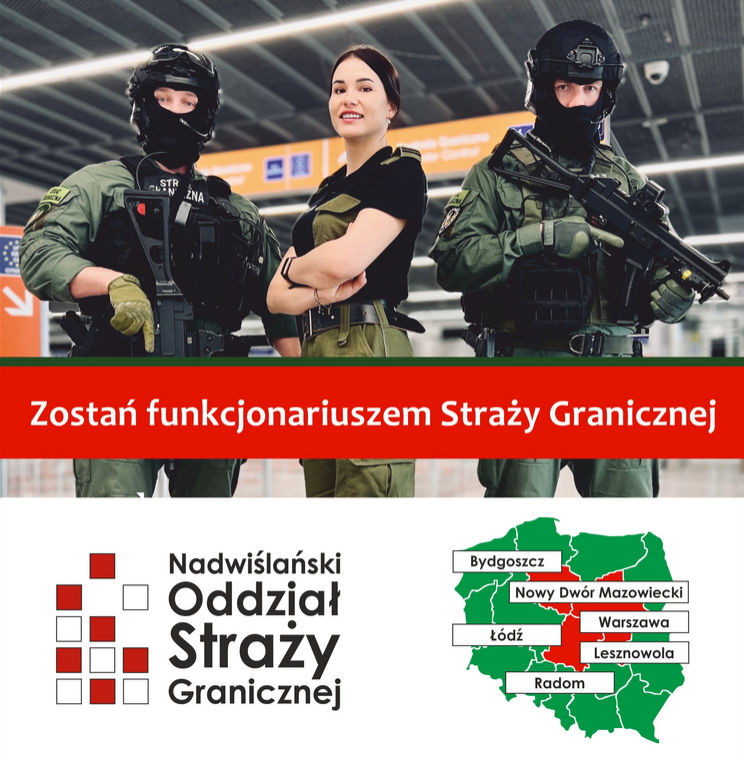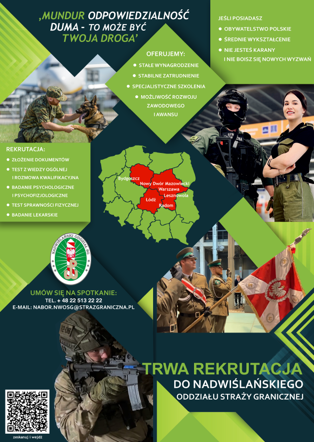 w ramach prowadzonego naboru kandydatów do struktur Nadwiślańskiego Oddziału Straży Granicznej, pragniemy wyjść naprzeciw oczekiwaniom mieszańców o pracy, w tym przypadku służbie, dającej niezależność finansową, poczucie stabilności, satysfakcję, możliwości doskonalenia zawodowego oraz rozwijania swoich zainteresowań.