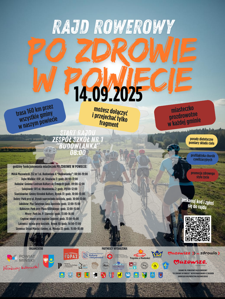Już 14 września 2025 r. ruszamy w wyjątkową rowerową podróż po wszystkich gminach Powiatu Mińskiego! Jednego dnia pokonamy trasę liczącą ok. 160 km, ale spokojnie - będziecie mogli dołączyć w dowolnym momencie i przejechać z nami od jednego miasteczka do kolejnego.