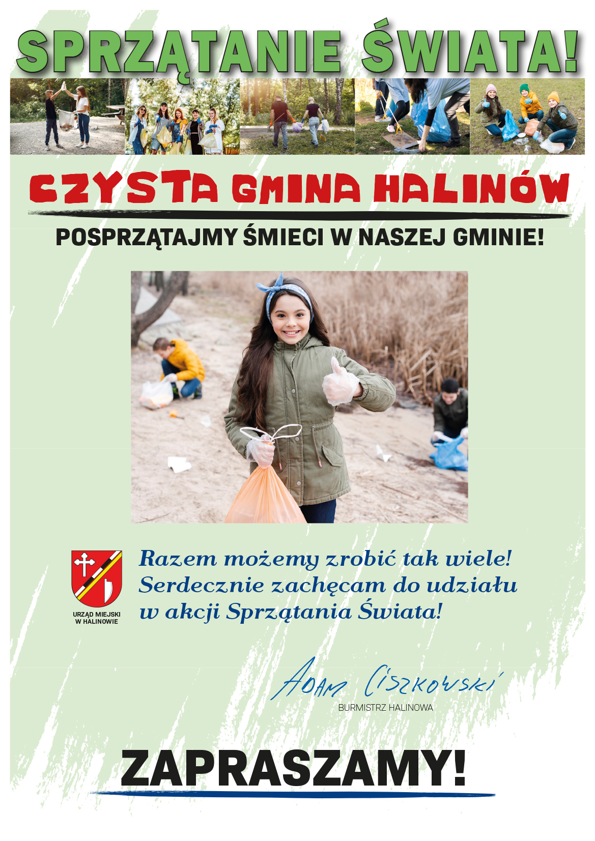 serdecznie zachęcamy do udziału w tegorocznej akcji „Czysta Gmina Halinów”, organizowanej w dniach 19–21 września 2025 r., w ramach ogólnopolskiej inicjatywy „Sprzątanie Świata”. Wspólnymi siłami zadbajmy o czystość i piękno naszej gminy.