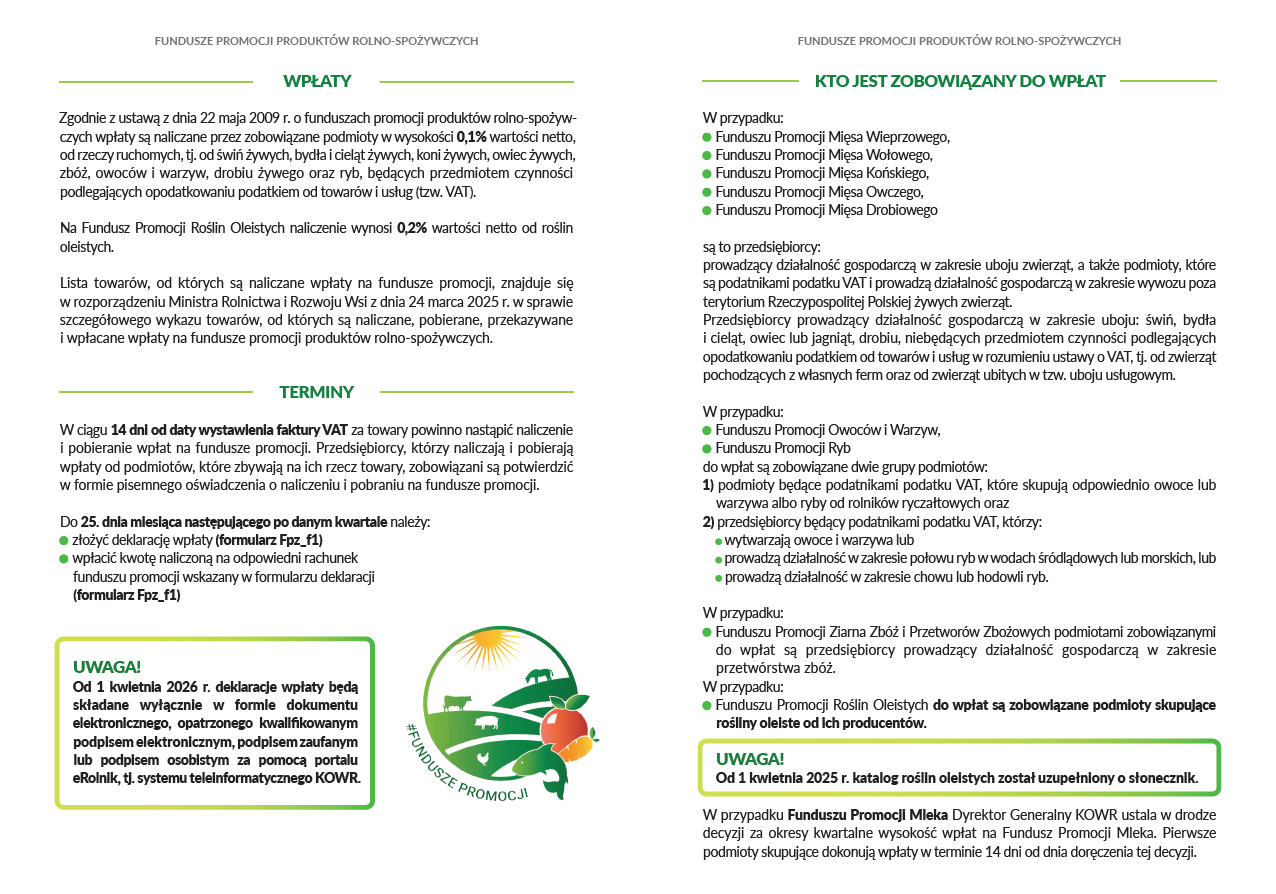 Na podstawie nowelizacji ustawy z dnia 21 lutego 2025 r. o funduszach promocji produktów rolno-spożywczych, z dniem 1 kwietnia 2026 r. wprowadzony zostaje obowiązek składania deklaracji wpłaty na fundusze promocji wyłącznie za pośrednictwem systemu teleinformatycznego KOWR, tj. platformy usług eRolnik: https://erolnik.gov.pl/#/.