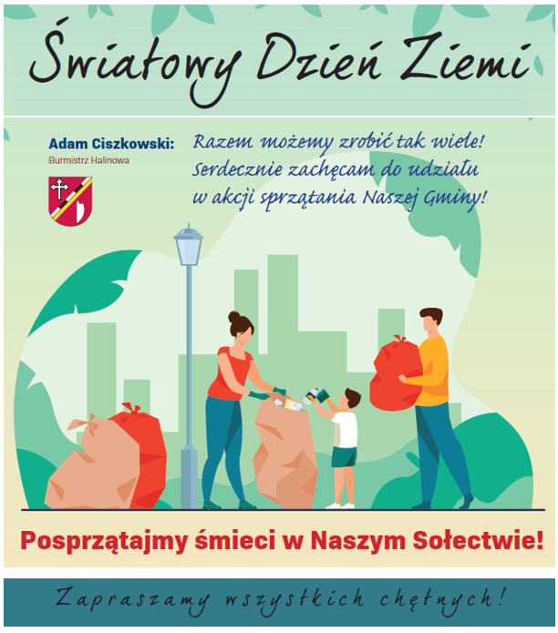 w związku z obchodami Światowego Dnia Ziemi serdecznie zapraszamy Państwa do udziału w akcji sprzątania terenu naszej gminy, organizowanej w dniach 11–26 kwietnia 2026 r.