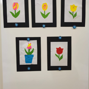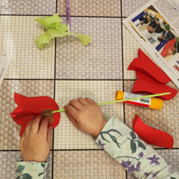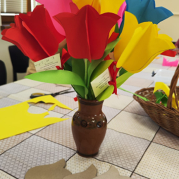 Wszystkie papierowe i wyjątkowo kolorowe kwiatki powstały z rąk małych artystów, z myślą o nadchodzącym święcie. Praca podczas zajęć przebiega zawsze w radosnej atmosferze, przy szeroko zakrojonej współpracy, co niewątpliwie zachęca do udziału w bibliotecznych warsztatach twórczych!